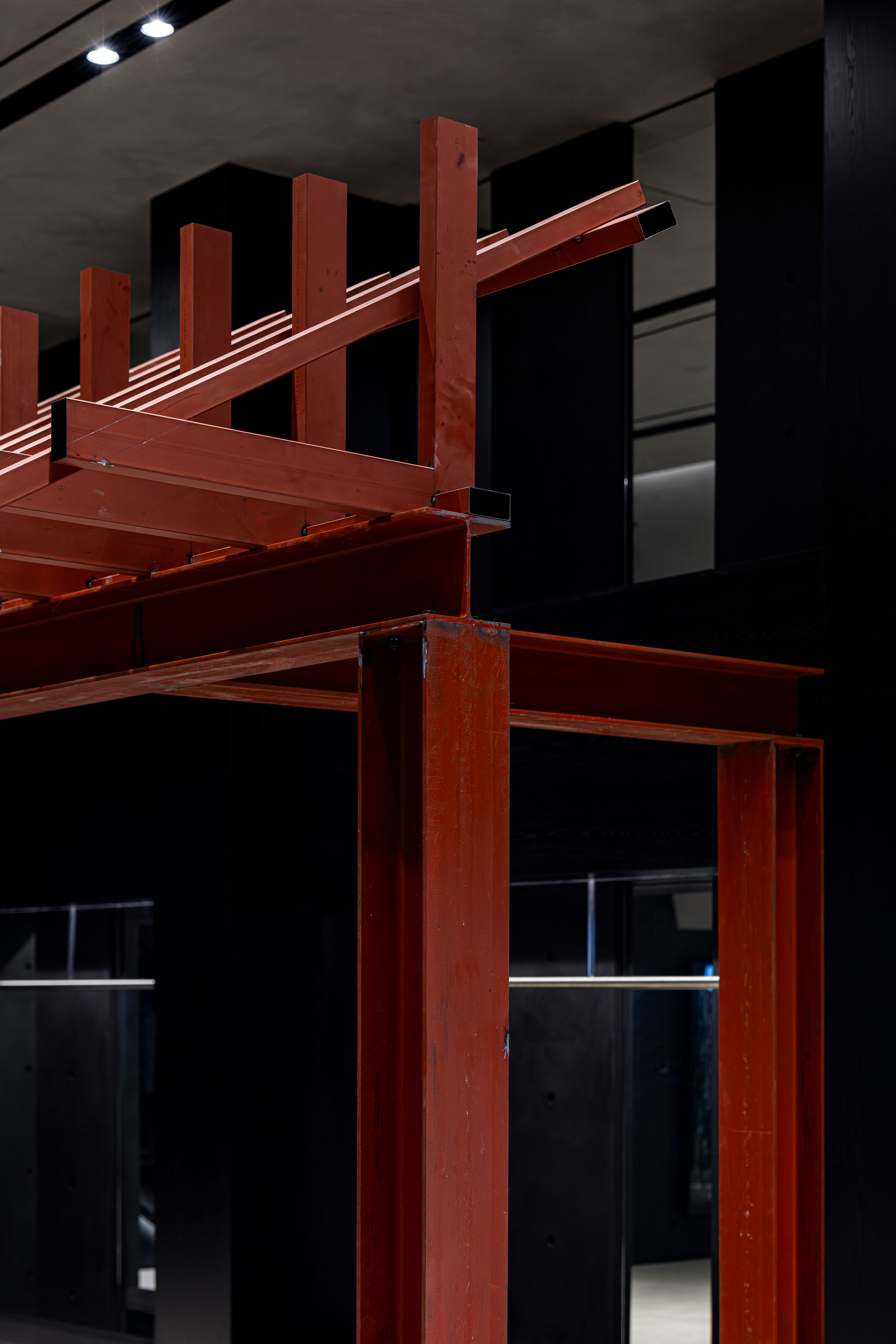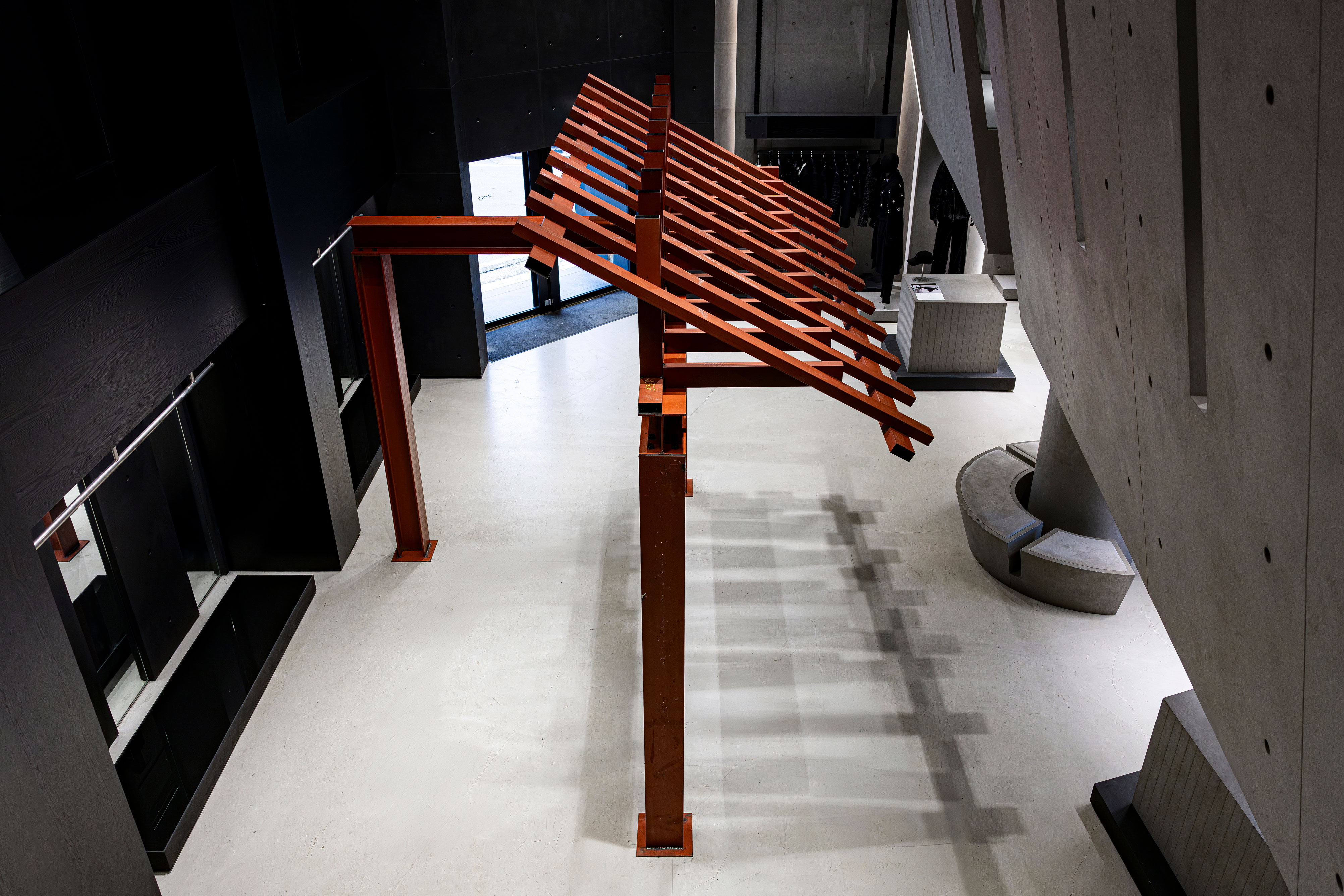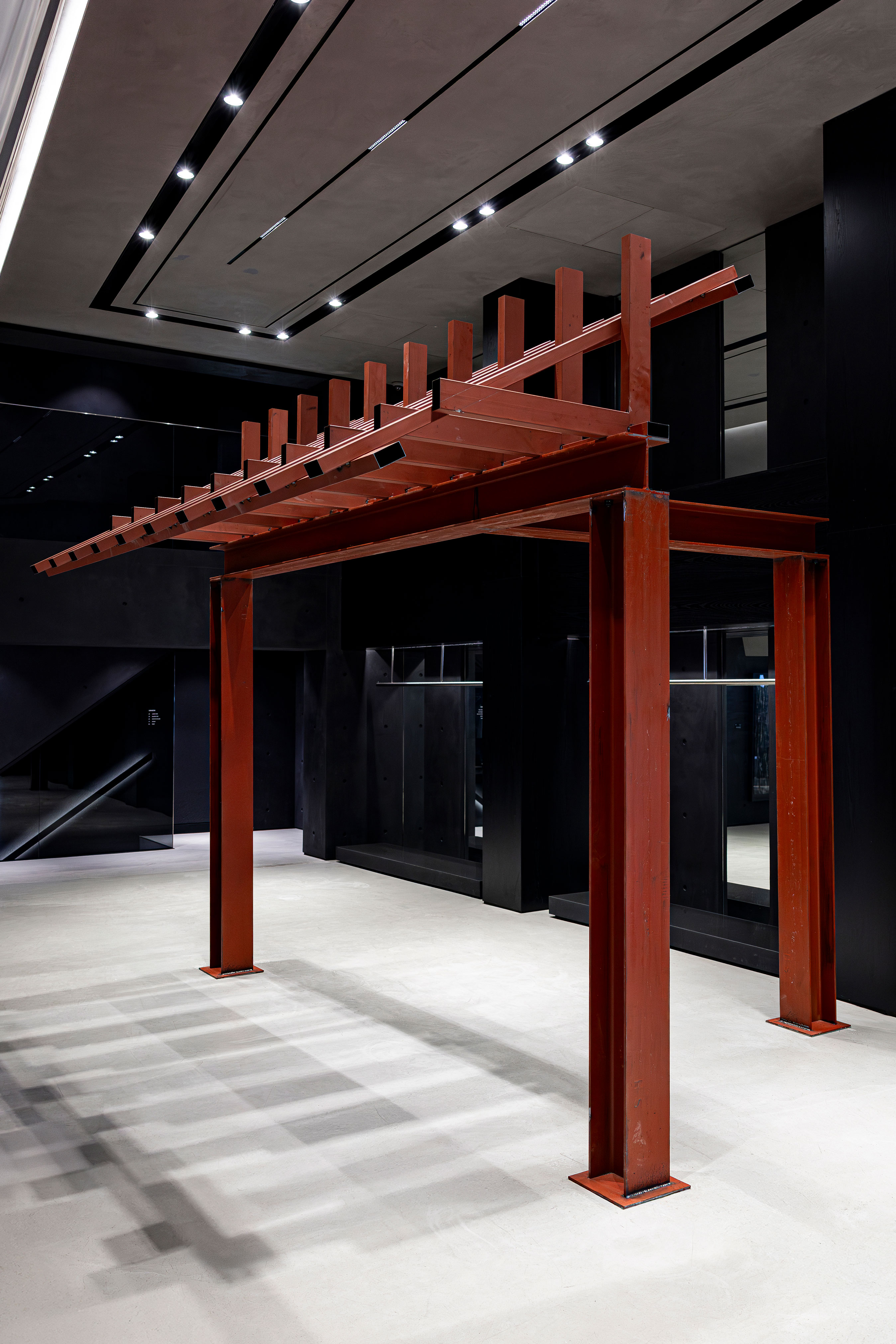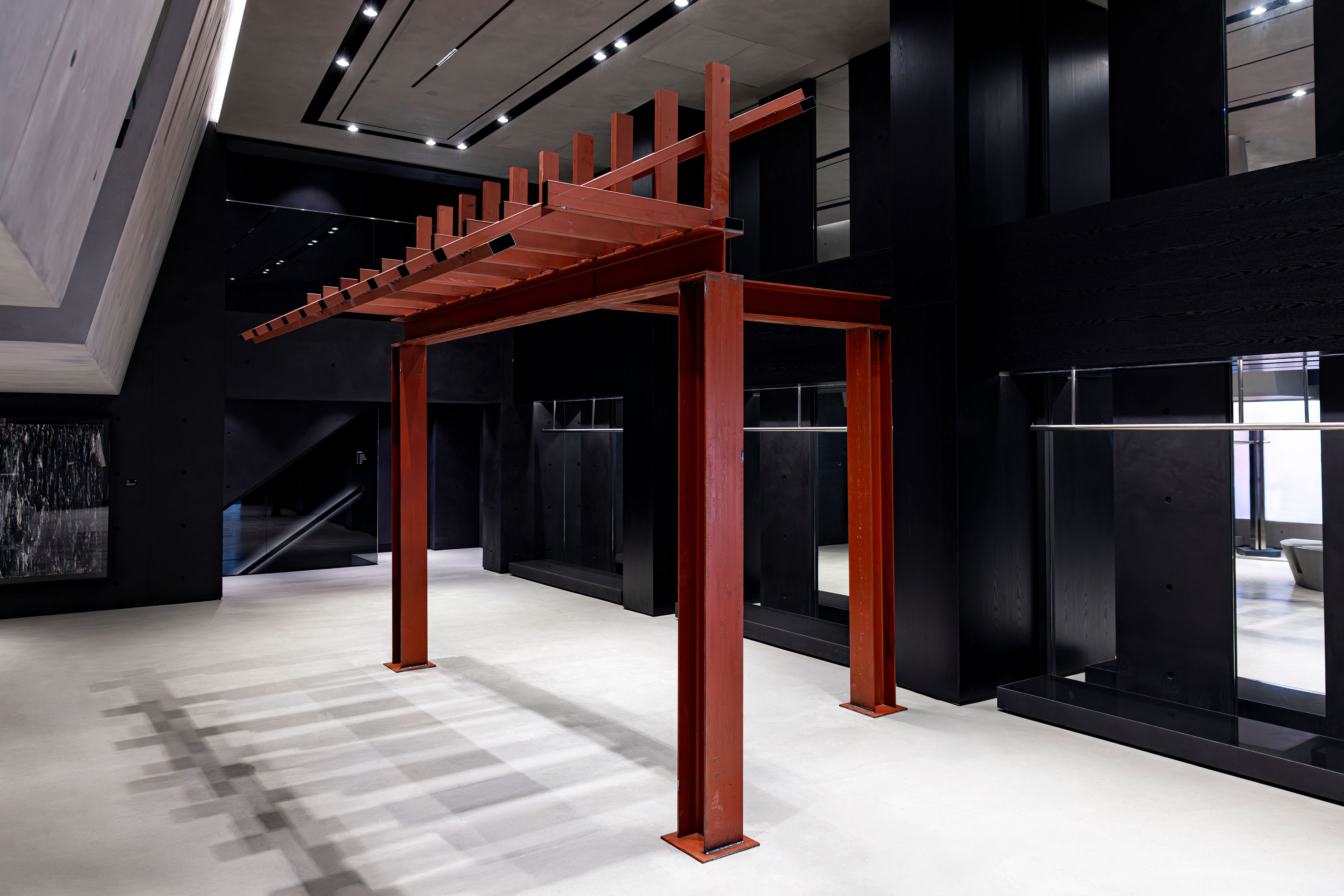 Pavilion Noir is an artwork in which the artist reinterprets the traditional Korean jeongja as the most spatial form of furniture. Its essential components—roof and pillars—are replaced with modern architectural materials such as H-beams and steel pipes.